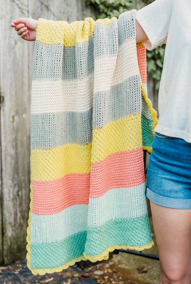 Varying stitch patterns weave through a series of 6 fun pastel colors to make the body of the Sweet Stripes Baby Blanket. The entire piece is finis...